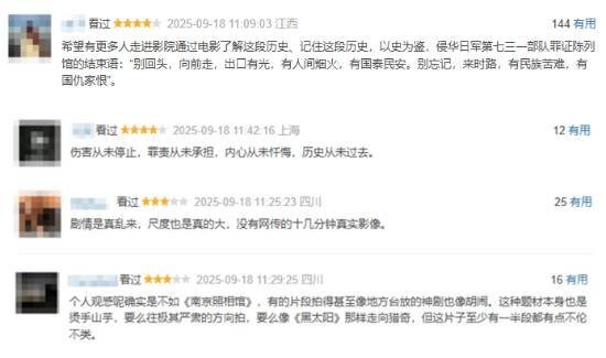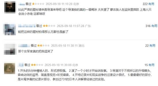 《731》在豆瓣平台的首批影评已经发布,观众对这部影片的看法出现了明显的两极分化。给出四星、五星好评的观众指出,该片在内容呈现上尺度较大,通过艺术化的方式还原了历史真实,强调这段历史应当被永久铭记,同时片尾附带的纪录片片段也被视为一大亮点;而给出三星及以下评价的观众则认为,影片存在剧情逻辑不够顺畅、拍摄手法有待提升的问题,部分涉及日本女军官的镜头也引发了不适感。
