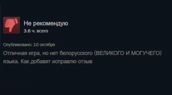 用户在评论里对这款游戏给出了好评,不过因为游戏没有提供他母语的支持,所以他最终给出了“不推荐”的评价。评论中还特别提到,希望游戏能增加对白俄罗斯语、乌兹别克语乃至巴什基尔语的本地化适配。