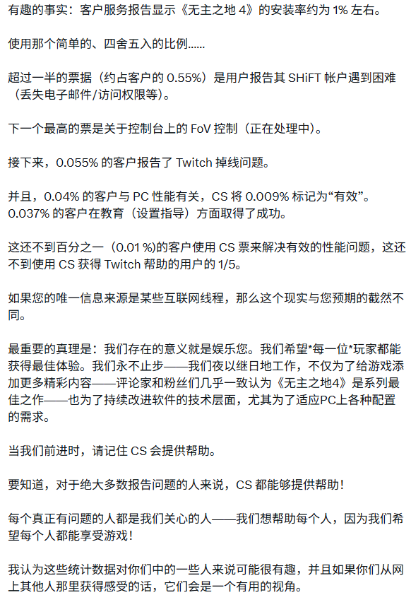 Pitchford透露,依据Gearbox客服数据,约有1%的玩家提交了工单,其中超半数与Shift账号相关,其次是主机视野(FOV)和Twitch功能问题。和PC性能直接相关的报告占比约0.04%,其中仅0.009%被判定为有效问题,另有0.037%的情况通过调整设置得以解决。