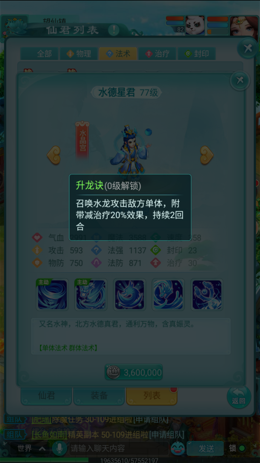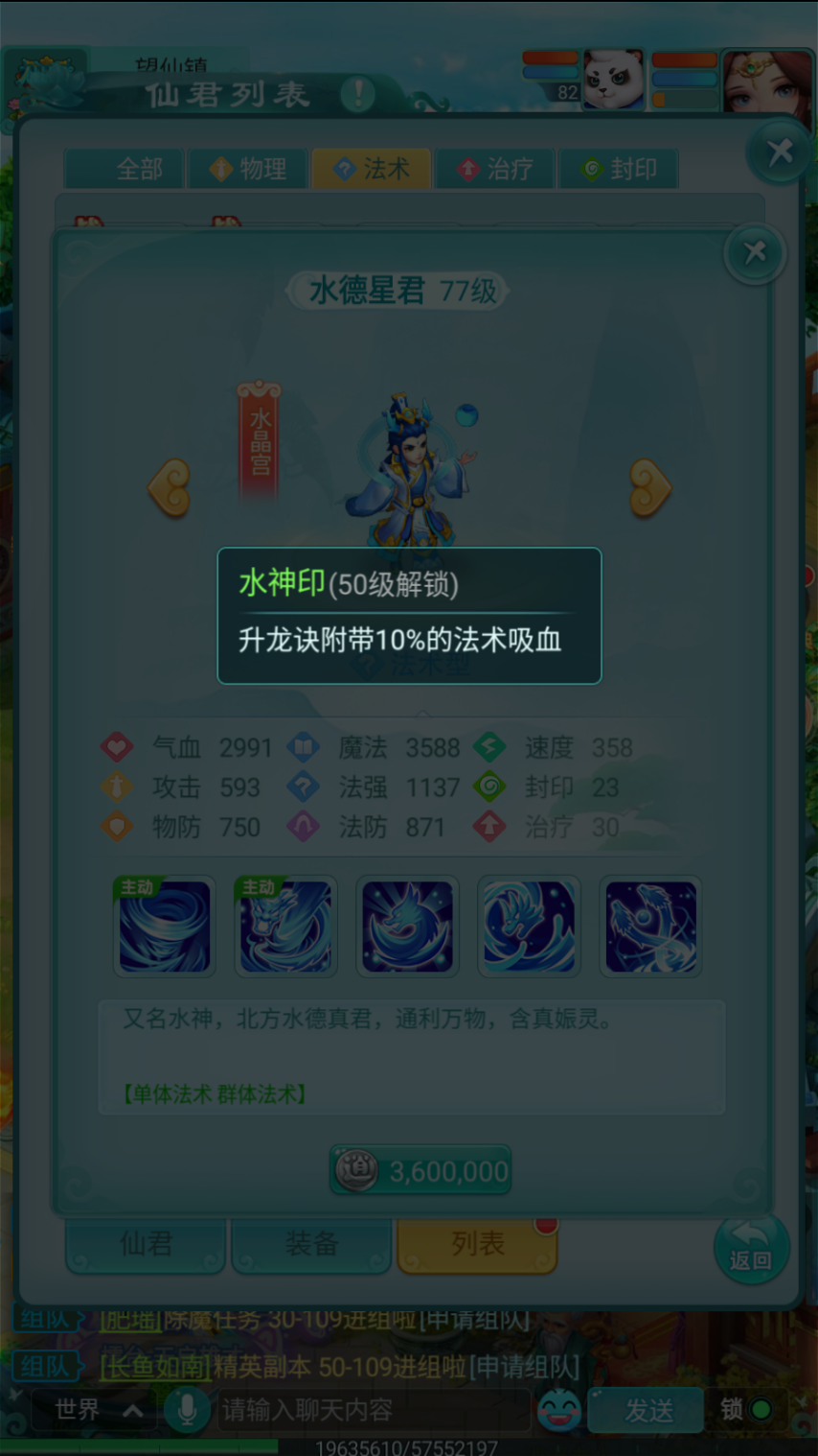 例如在角色达到50级时解锁的水神印,能够使水德星君释放的升龙诀额外附带10%的法术吸血效果。这一特性显著提升了他的生存续航能力,让他转变为兼具输出与承伤能力的持久作战型角色,堪称实用性极强的被动技能。