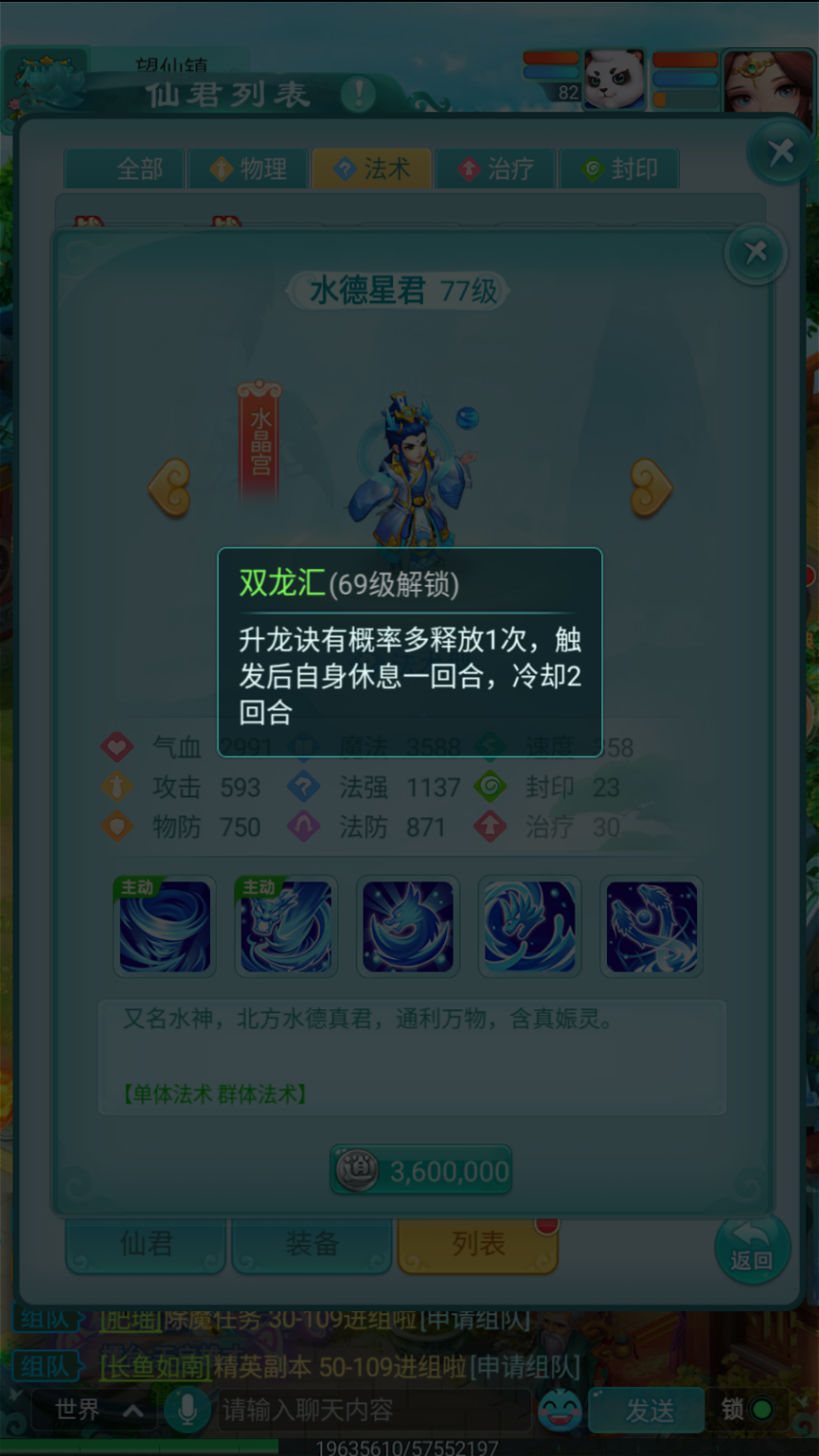 69级时会解锁“双龙汇”被动技能,它能让升龙诀有概率额外释放一次,不过触发后需要休息一回合,且该被动的冷却时间为两回合。这个被动技能极大地增强了水德星君的爆发输出能力,连续释放两次升龙诀所造成的伤害,可不是一般对手能够抵挡得住的。
