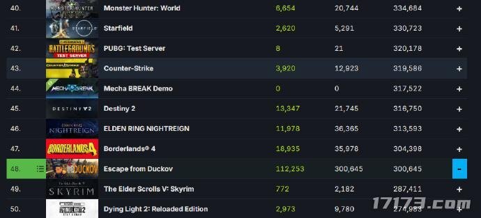 这一成绩不仅意味着《逃离鸭科夫》的热度在持续攀升,还让它成功进入Steam平台所有游戏在线峰值排行榜的第48位,超过了《上古卷轴5:天际》(284,350人)与《消逝的光芒2:重装上阵版》(296,000人),和排名第47位的《无主之地4》(峰值约304,500人)之间仅相差不足4000人,很有希望在短时间内完成超越。