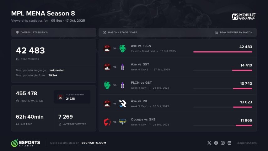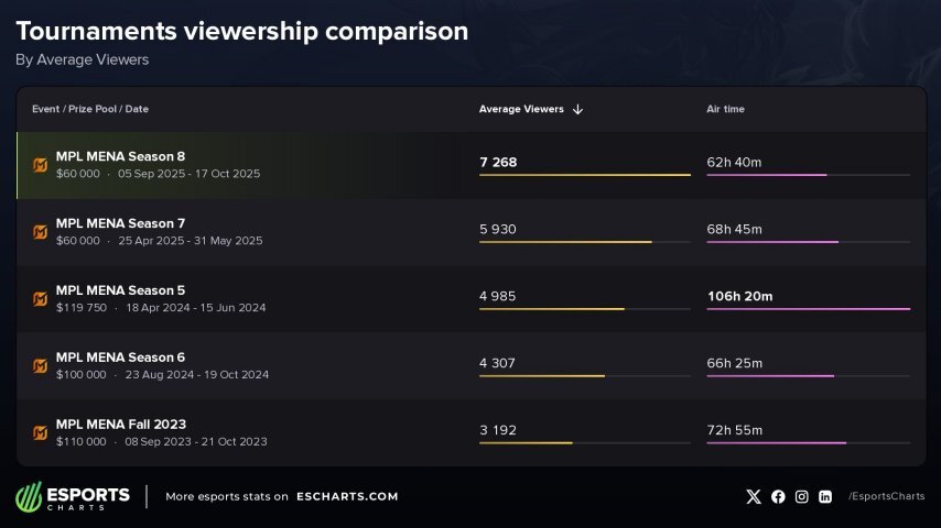 根据第三方权威电竞数据平台Esports Charts的统计,MPL MENA第八赛季刷新了多项收视纪录。对比上一赛季,最高峰值在线观看人数(PCU)达42475人,增长66%;平均同时在线观看人数(ACU)为7268人,增幅23%,创下赛事ACU新高;总观看时长超455459小时,增长12%。这些数据清晰表明,MPL MENA联赛的观众群体不断扩大,赛事在地区的影响力正逐步增强。