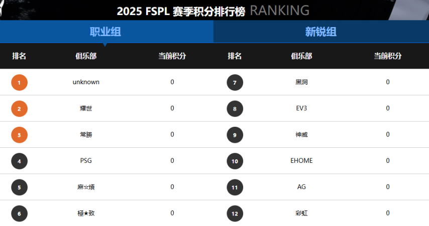 FSPL职业联赛的12支俱乐部将展开为期8周的积分循环赛,其中职业组和新锐组各自会进行66场BO3赛事。