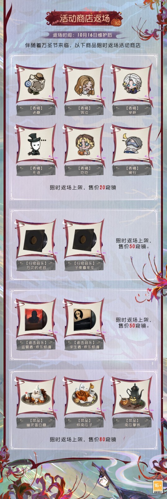 10月16日维护后,往年万圣节主题活动时装、随身物品、个性动作和家具等已返场上线。