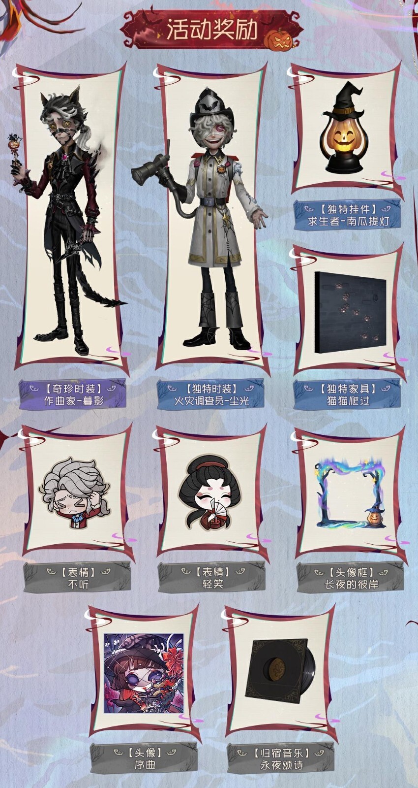 10月23日维护结束后,主题活动将正式开启,玩家参与活动便能获得【奇珍时装】作曲家-暮影、【独特时装】火灾调查员-尘光、【独特挂件】求生者-南瓜提灯,以及头像、头像框、家具、表情等丰富奖励。