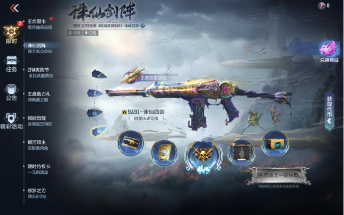 诛仙剑阵最后一轮抽奖已启动!你的9A91-诛仙四剑是否完成觉醒?解锁专属强力技能“诛仙四剑”后,切换剑匣可分别触发对躯干、头部、腿部、手部的伤害强化效果,让每一次射击都更具杀伤力,助力你在战场上实力飙升!此外,秦俑挂饰与秦铜盾挂饰时隔一年再度返场,切勿错过此次机会!