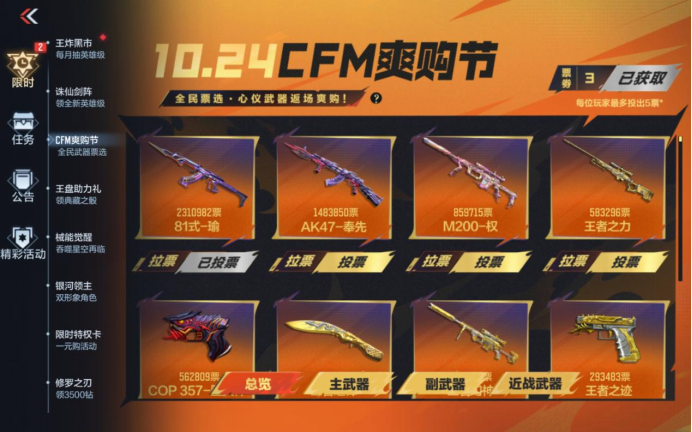 全民票选活动正式开启,由你亲手决定哪些武器能重返赛场,让你心心念念的返场心愿彻底实现!每人最多可投5票,将票投给你最想拥有的心仪武器。本次票池阵容诚意满满,不仅汇聚了81式-瑜、AK47-奉先、M200-权等三国主力武器,更有王者之力、王者幻神、王者之锋等高人气王者武器强势加入!快拿起手中的票,为你朝思暮想的武器投上关键一票吧!