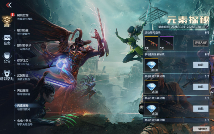 全新生化追击地图“元素秘境”现已震撼上线,同步开启的限时活动“元素探秘”携多重豪华福利惊喜登场,所有奖励均可轻松无门槛领取。活动期间,玩家登录游戏即可直接获得HK417-朱雀(7天)与VEPR12-紫魔(7天);完成1场任意对局,就能领取1000钻石,更有机会赢取王者之骰;参与10局“元素秘境”地图的游戏,还可解锁超酷炫的永久雷豹披风!