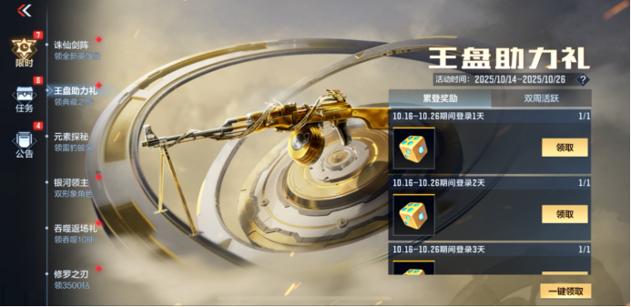 王者之盘即将在典藏飞行棋中重磅登场,枪身环绕着一整条璀璨的金龙,视觉震撼力瞬间拉满。作为王者级武器,它不仅外观极具吸引力,实战表现也同样出色!此外还有福利助力活动,只要完成登录和对局这两项任务,就能总共领取7枚典藏之骰与3000钻石,帮助你更快获取王者之盘。
