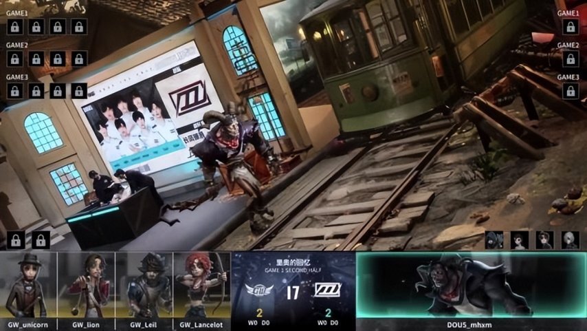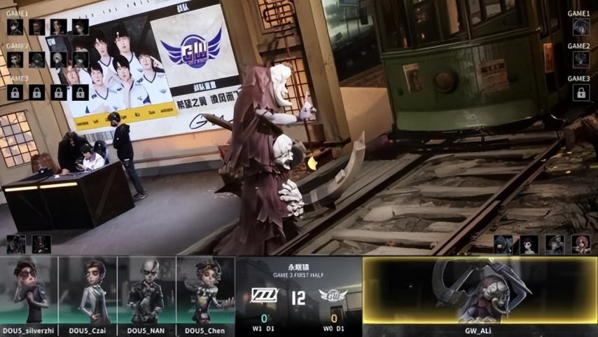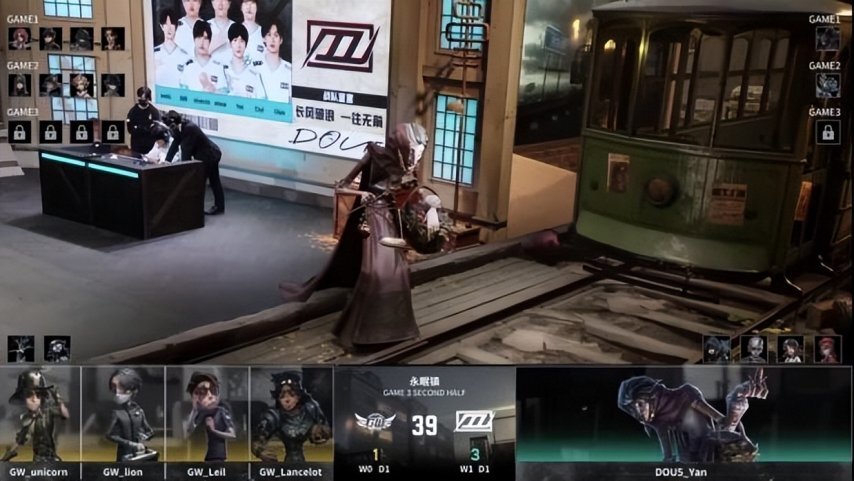 DOU5战队的求生者阵容确定为空军、飞行家、守墓人、病患,禁用角色为“跛脚羊”;GW战队的监管者选手ALi则选用了歌剧演员,其禁用列表包含先知、古董商、佣兵、入殓师。
