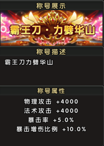 称号属性:物理攻击增加4000点,法术攻击增加4000点,暴击率提升5.0%,暴击增伤比例提高10.0%