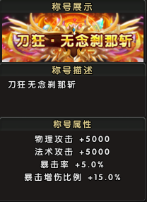 称号属性:物理攻击提升5000点,法术攻击增加5000点,暴击率提高5.0%,暴击增伤比例提升15.0%