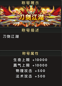 称号属性:生命提升10000点,真气增加10000点,物理攻击加成500点,法术攻击附加500点;
