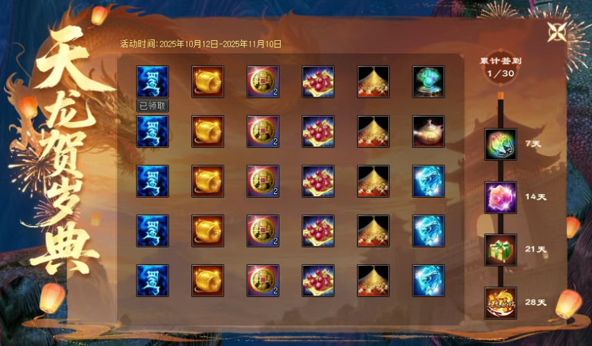 累计签到28天,更有限定称号:天龙献瑞(所有属性+20)相送!