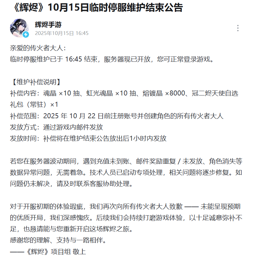同时,公告里有一条“时间补偿”规则:以开服时间为起点,每修复1小时就额外补偿2000熔镀晶。照现在的情况,实在说不准今天的奖池还能累计到什么程度。