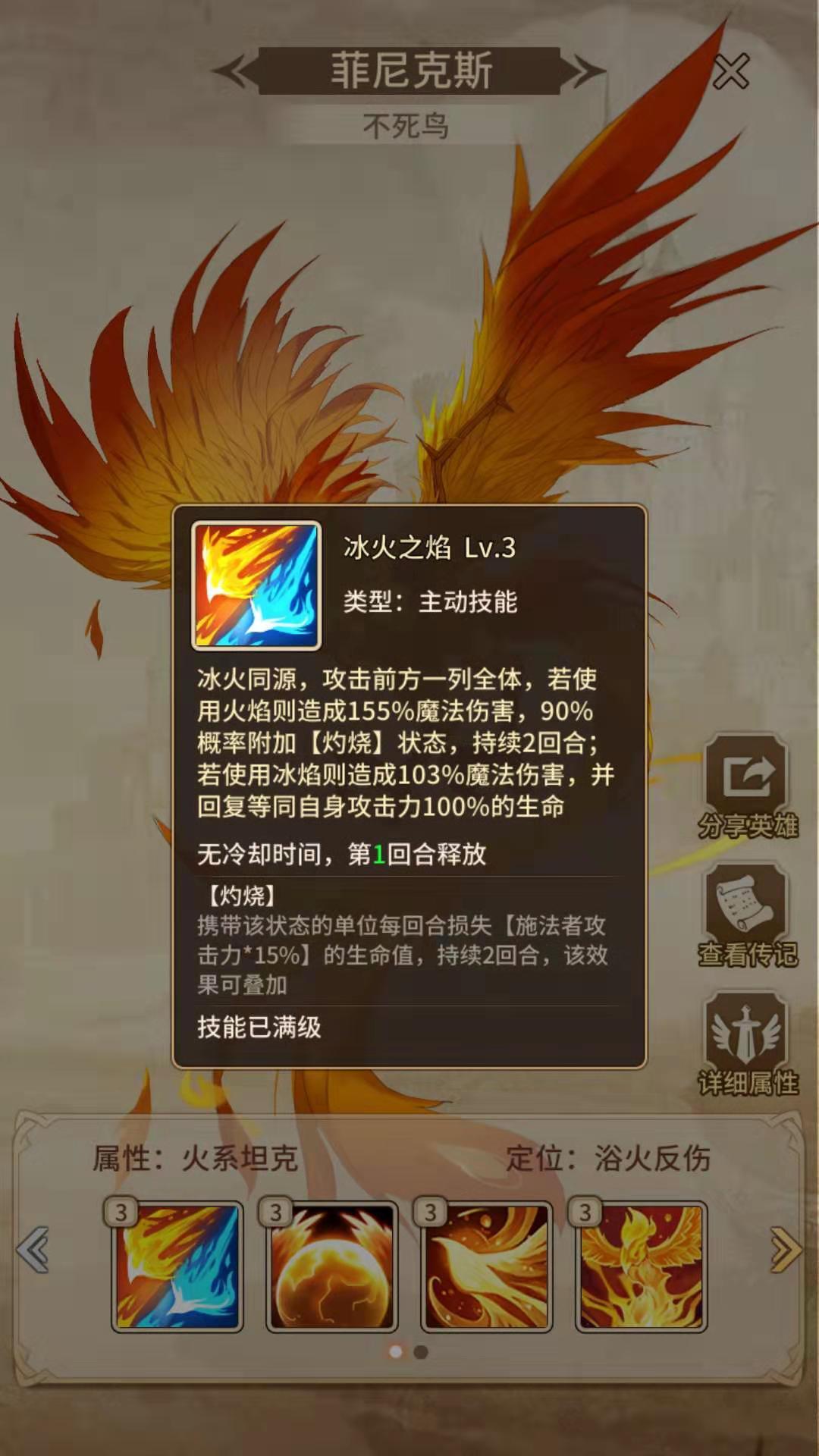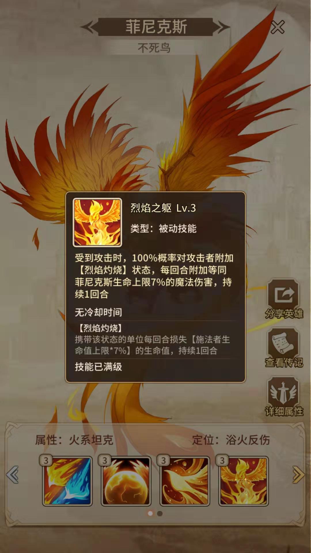 在了解了菲尼克斯的技能后,我对他适合搭配的阵容已经有了清晰的思路。这套阵容主要有两种组合方式:一种是围绕复活与禁止复活机制构建的复活流派;另一种则是通过叠加【灼烧】和【烈焰灼烧】效果形成的烧血流派。