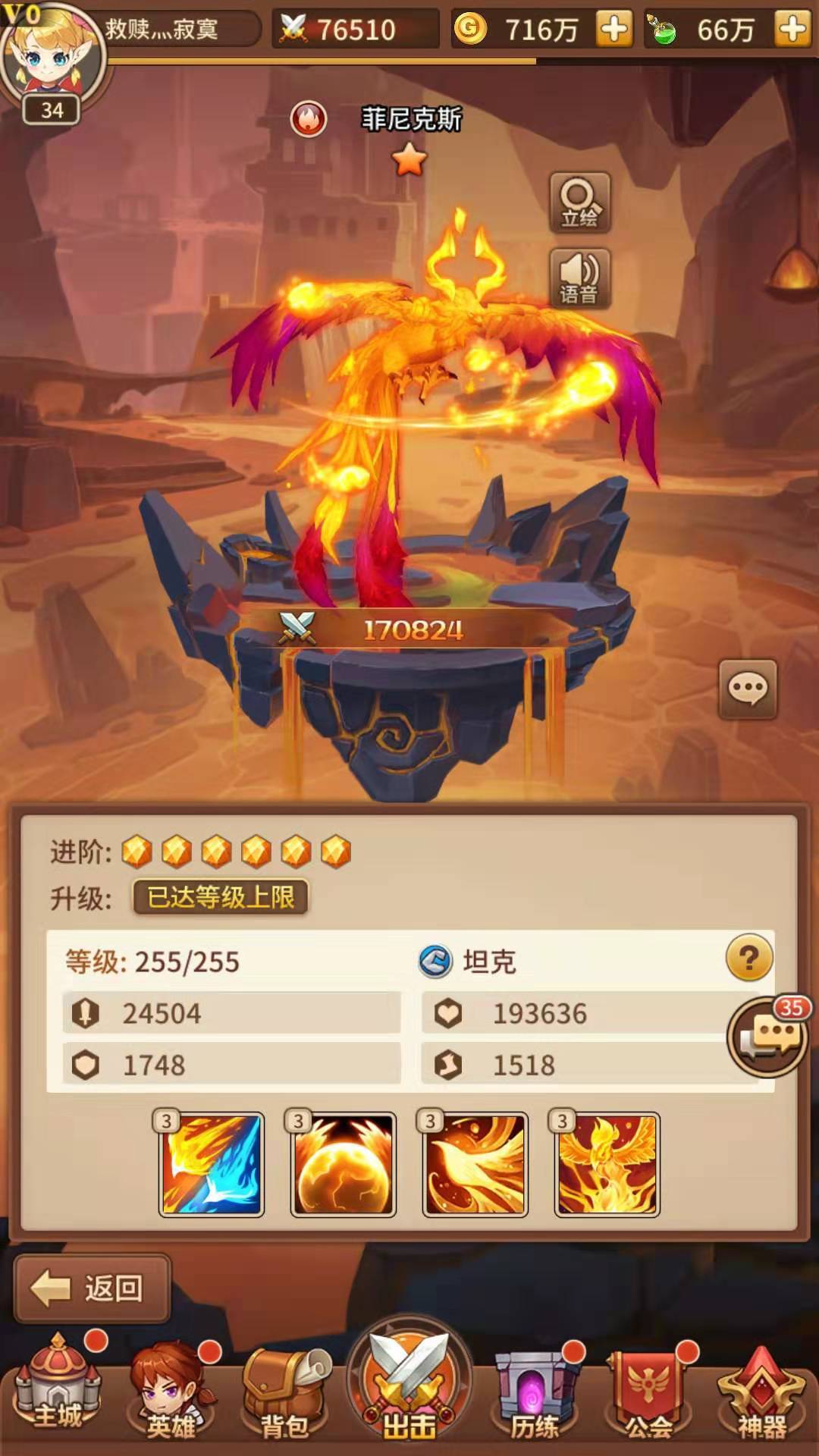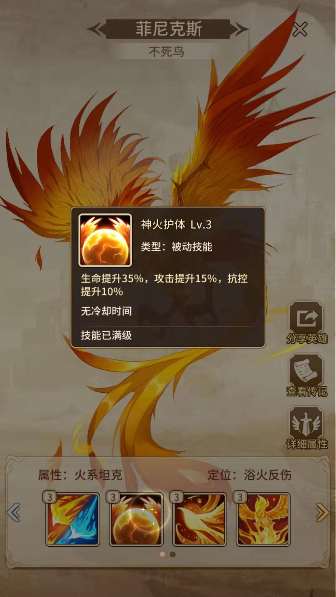 菲尼克斯是一名火系的坦克英雄,先来看一下他的属性。