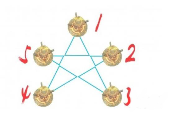 我们把正对着游戏玩家正前方最上方的石柱编号设为1,然后按照顺时针方向依次给其他石柱排序,具体情况如图所示: