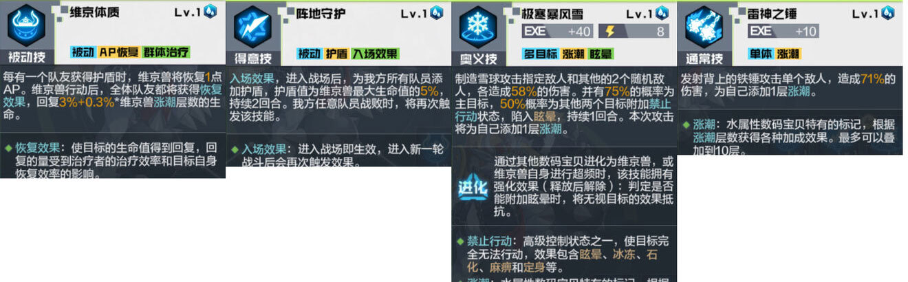 当没有队友获得护盾时,维京兽会恢复1点AP。维京兽行动结束后,所有队友都会获得恢复效果,回复3%的生命,并且还会有0.3%的加成效果,该加成效果主要与维京兽的涨潮层数相关。