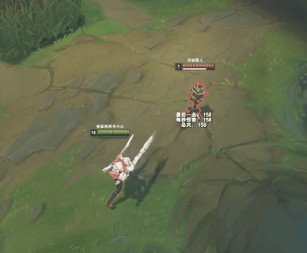 如图所示,剑魔朝着草人释放二段Q时,攻击间隔似乎并不理想;但如果把二段Q的释放位置稍微偏移一点,反而能命中草人。这说明剑魔二段Q的边缘区域射程更远,在实际对战中,也更有助于剑魔追击想要逃脱的目标单位。