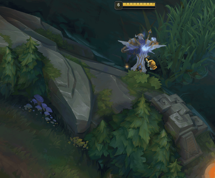 剑魔的E技能从指示器看范围似乎很短,但足以穿过峡谷里的大部分墙体。比如北路河道靠近蓝色方的那堵墙,只要玩家找对方向,还是能轻松越过去的。