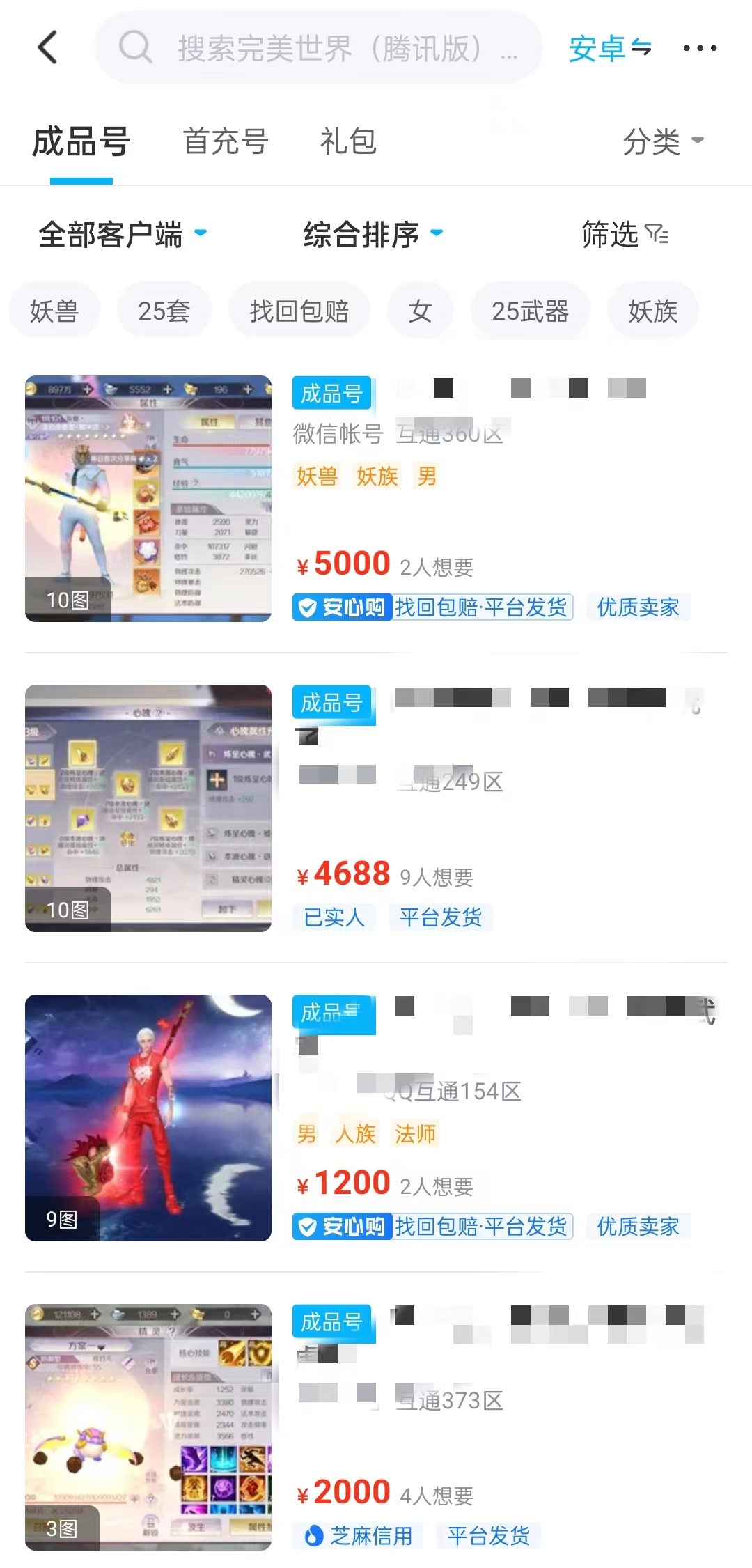 小编推荐交易猫的首要原因,是平台上完美世界账号资源十分丰富,从高氪成品号到中氪半成品养成号应有尽有,而且价格颇具性价比。只需在首页搜索“完美世界手游”进入专区,所有相关账号便会集中展示,大家还能按照价格、装备、妖兽、等级等条件筛选,轻松快速找到心仪的账号。