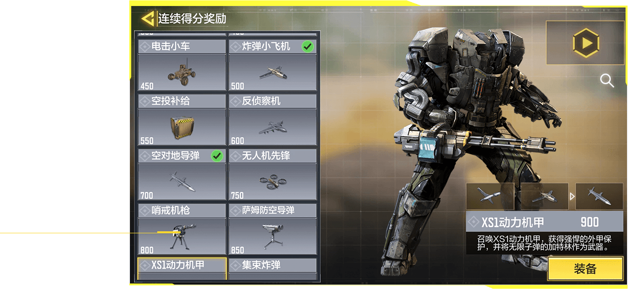 玩家在战斗过程中也能对连续得分奖品进行调换,游戏里玩家累计的分数越高,就能兑换威力越强的奖品,例如这个900分的XS1动力机甲。