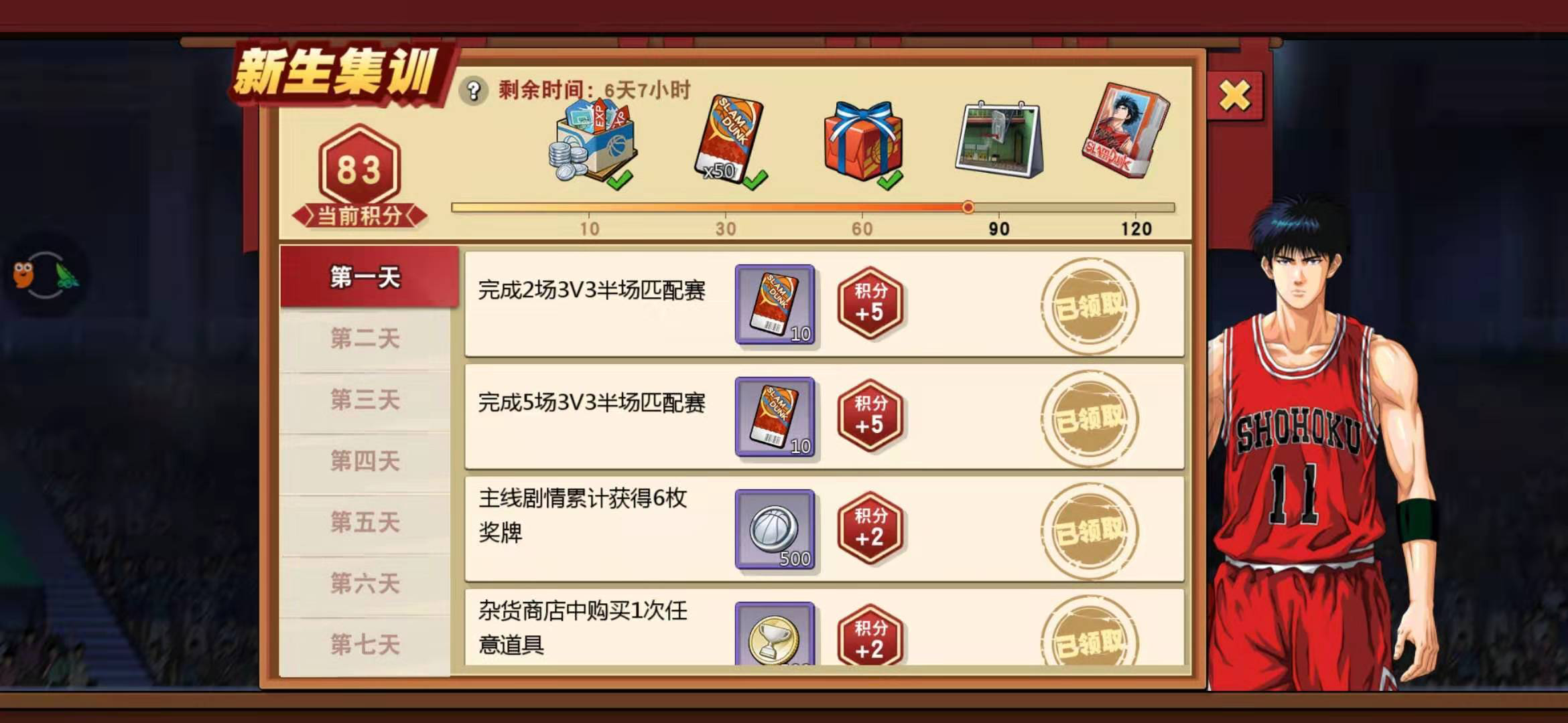 新生集训是平民玩家获取球员流川枫的最优方式,只要完成集训任务,就能免费得到流川枫的永久使用权。