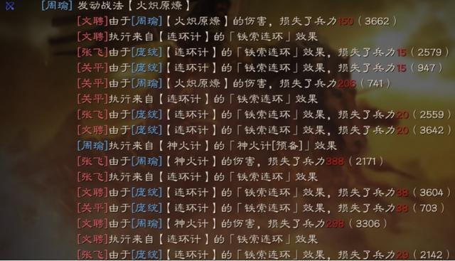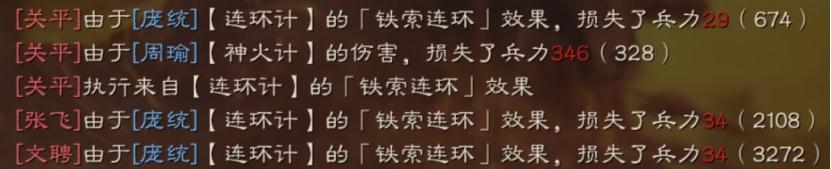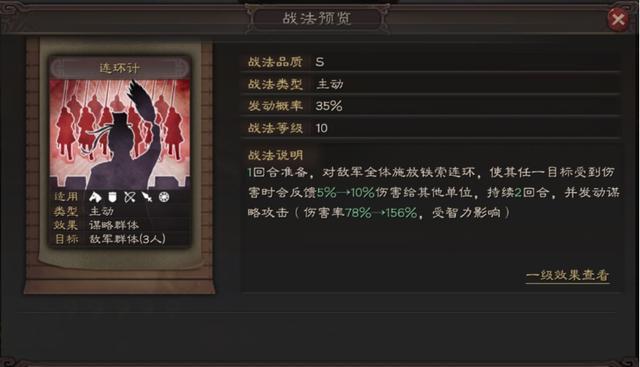 3拥有35%发动几率的预备战法,往往意味着它具备出色的特效,就像破阵摧坚那样。连环计本身有着相当不错的伤害,并且它是先为敌人施加铁索连环状态,之后再进行谋略攻击的战法,这使得该战法一直拥有十分优异的输出能力,其实际效果如图所示: