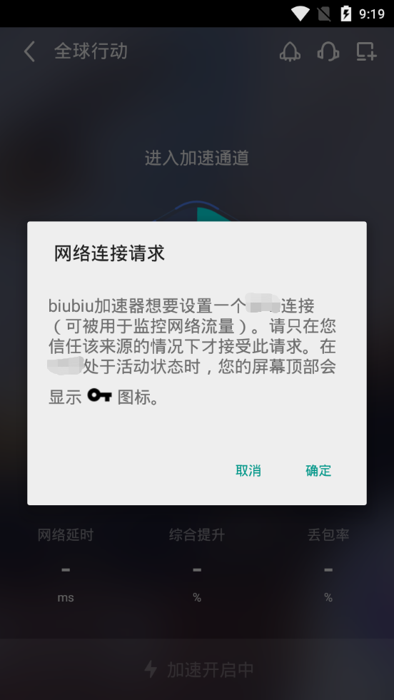 选择加速后,要是各位是首次用biubiu给游戏加速,会弹出下面这样的窗口,直接点击确定就行。