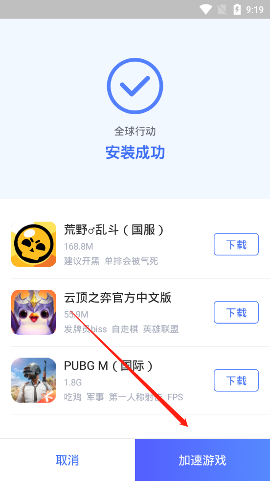 安装完成后,若大家想直接启动游戏,可选择下方的“加速游戏”选项;当然,大家也可以稍后前往biubiu首页找到该游戏,再进行加速操作。