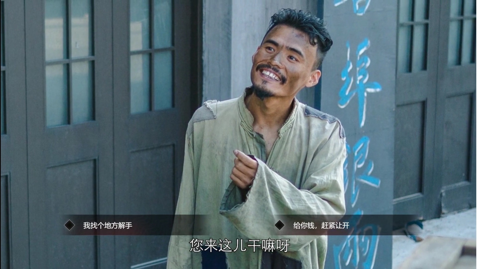当然乞丐这类人,通常都是看重利益的(这点在后续剧情里也能看到),所以我们选“给你钱,快让开”这个选项,好让乞丐走开。