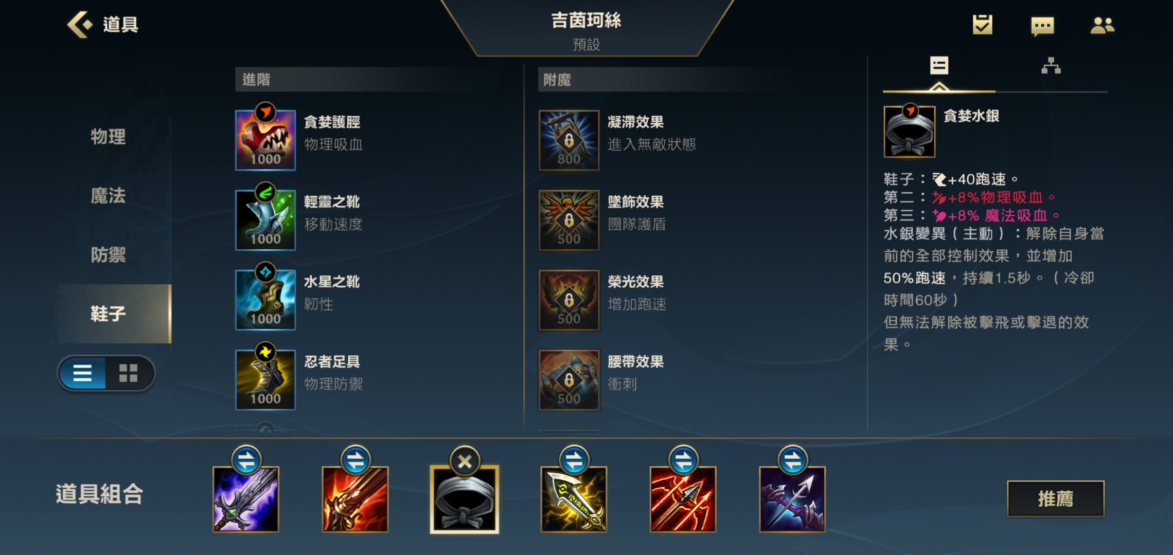 金克丝能当作收割型AD来输出伤害,小伙伴们出第三件装备时,可以把吸血鞋升级成水银鞋,团战时关键时候用它加速和解控,这样就能保证自己持续输出了。