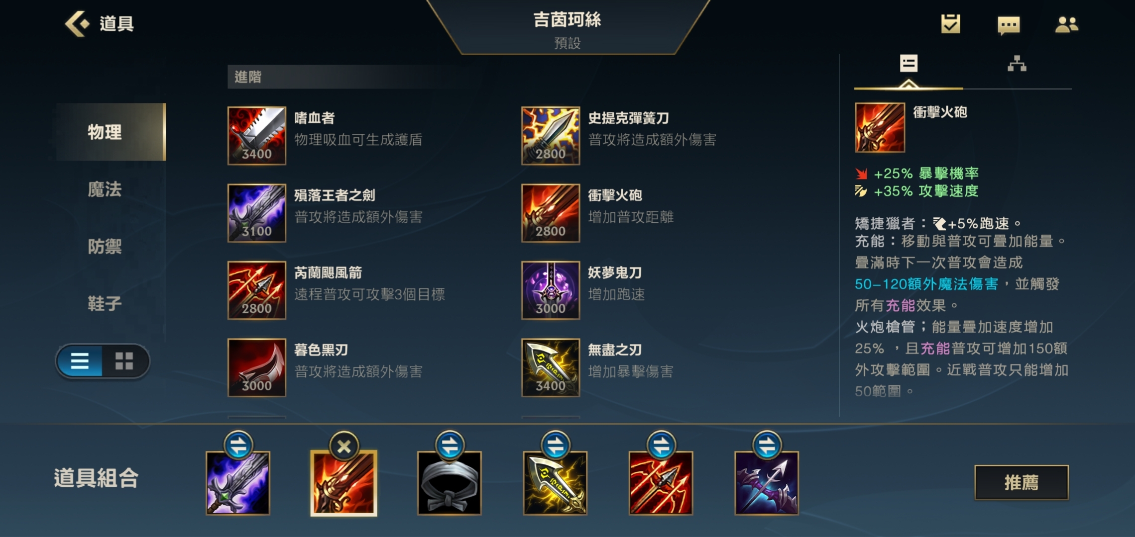 第二件装备我们选择火炮,它能有效提升我方的移速、攻速与暴击率这三项属性,并且火炮的充能被动还可以显著增强金克斯的射程和伤害输出能力。