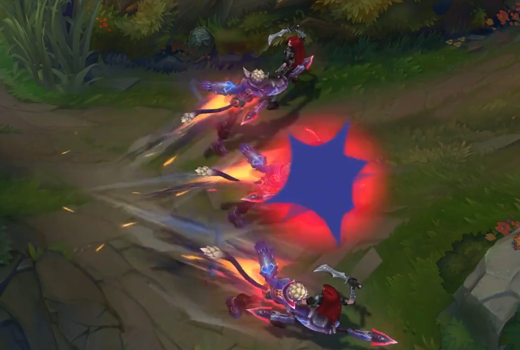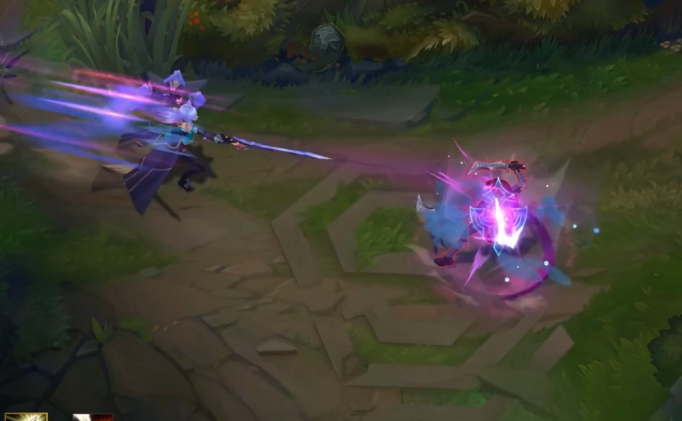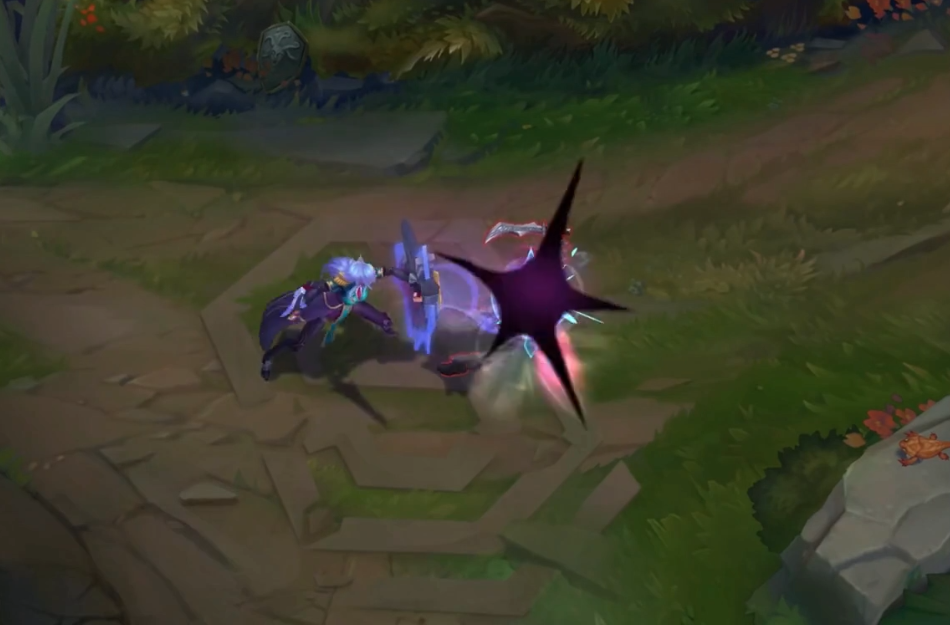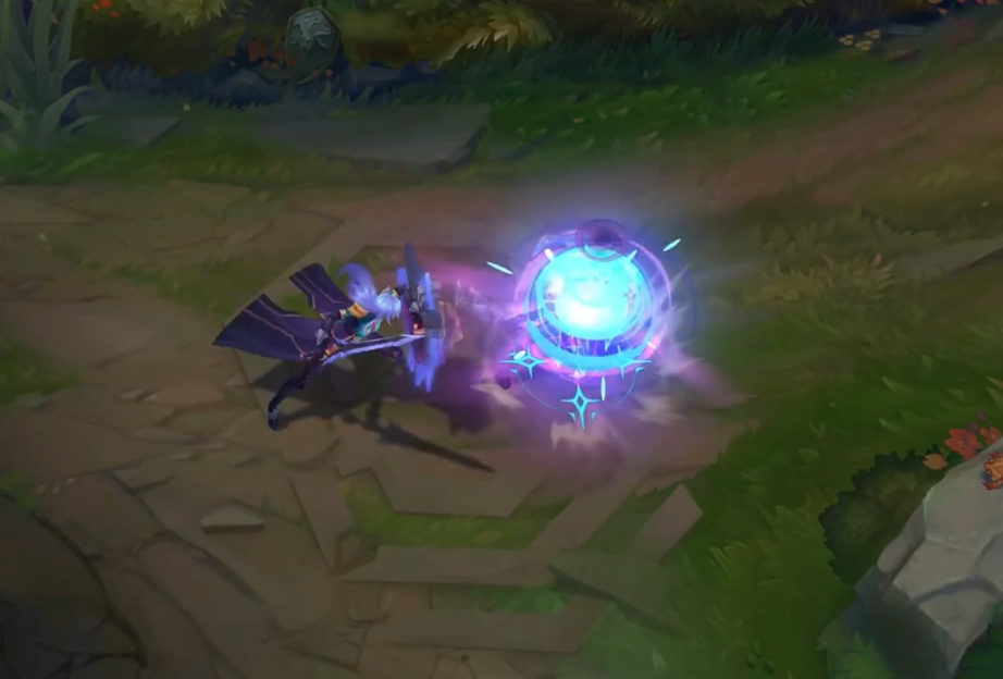 Q技能的特效是炸开效果,和之前几款皮肤相比其实没有太大差异,但这种蓝色魔法特效确实是蕾欧娜独有的,带着梦幻般的光效。