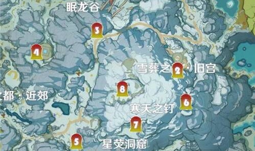 在探索版本里,我们会为旅行者详细说明神瞳的具体位置,让大家能更轻松地获取神瞳。龙脊雪山可划分为五个区域来讲解,分别是:1.覆雪之路,2.雪葬之都·旧宫,3.眠龙谷,4.雪葬之都及其周边区域,5.星萤洞窟外部。
