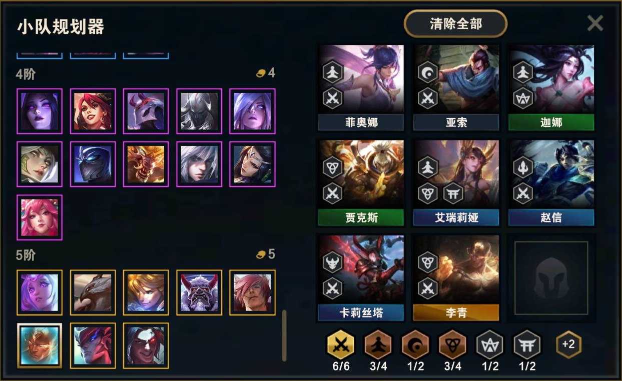 这套阵容的组成英雄包括:天选之人无双剑姬菲奥娜、疾风剑豪亚索、天选之人风暴之怒迦娜、武器大师贾克斯、天选之人刀锋意志艾瑞莉娅、德邦总管赵信、复仇之矛卡莉斯塔以及盲僧李青。