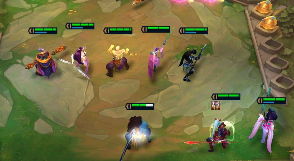 站位安排如下:武器大师置于第一排正中间,剑姬、赵信这类手短英雄分列两侧,以此充分发挥鸟盾的作用;盲僧站在第二排的角落位置,方便技能命中更多敌人;卡莉斯塔与风女则放在最后排就可以了。
