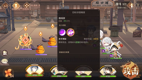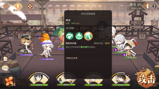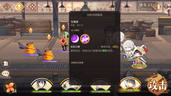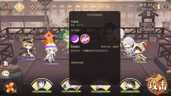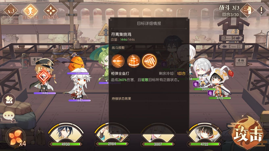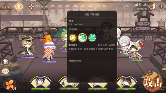 前面两场战斗难度不大,第三场才是本关卡的关键所在。观察对方阵容,包含饺子、符离集烧鸡、青团和不良鸡。其中饺子属于治疗类角色,其二技能与大招均具备生命恢复效果,尤其是大招还能实现群体恢复,因此我们需要集中所有火力优先对他发起攻击,把全部伤害都倾泻在他身上,让每个角色都释放伤害最高的技能,甚至是大招,务必在第一回合就将他秒杀。如果我方队伍中带有治疗型角色,则需要根据我方角色的血量状况,来决定是继续攻击敌人,还是为我方角色进行加血或施加护盾。