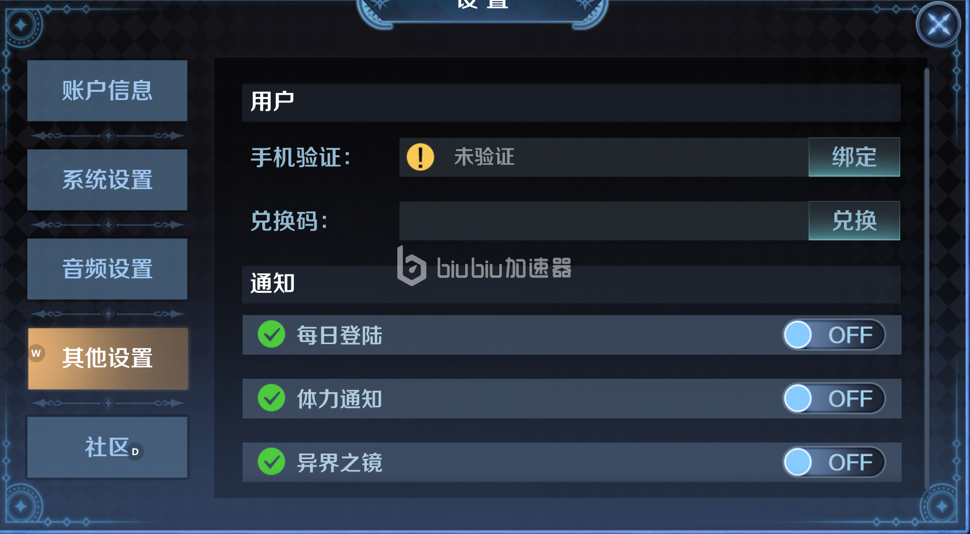 这个设置界面包含丰富功能,用户可在此查看个人账户信息,也能对系统、音频及其他项目进行配置。兑换码功能就位于其他设置板块内,点击进入后即可找到填写兑换码的按钮。兑换码的获取渠道多样,比如大家可以参考其他攻略,那里有小编整理分享的兑换码信息。