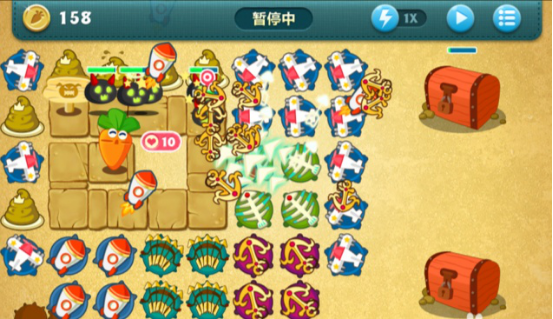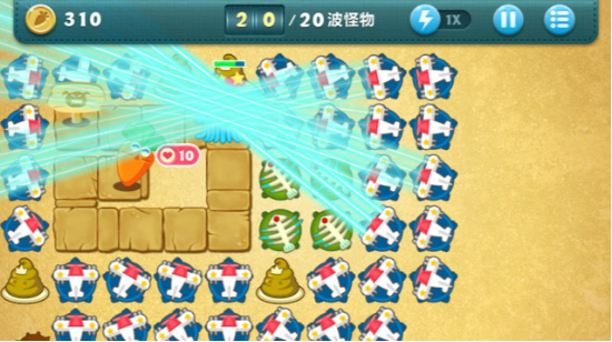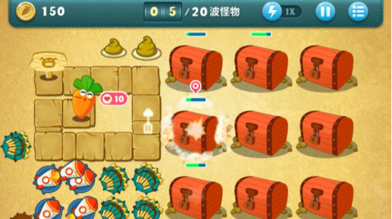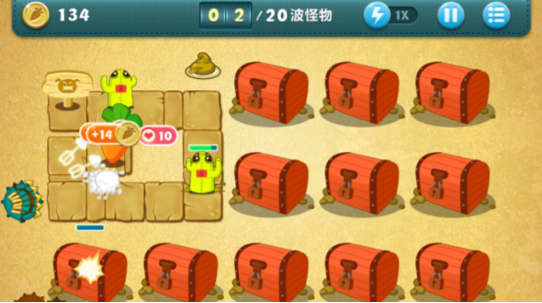 为了留出更多时间攻击宝箱,不妨在上方靠近怪物的位置放置一个能减缓其移动速度的道具。这个形似便便的装备其实挺实用的,它不仅能降低怪物的进攻速度,还具备不弱的攻击性,用来抵挡前几波怪物基本不成问题。