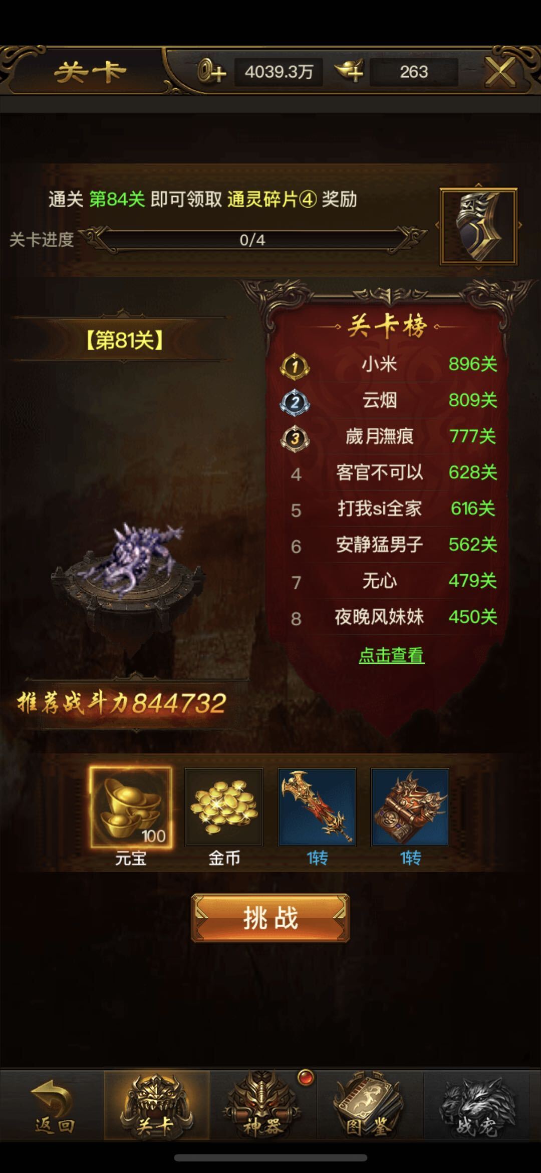 一转达到八十级后,玩家即可开启关卡闯关玩法。每个关卡中都会刷新出一个boss,成功击败boss后,就能获得丰厚的元宝奖励。关卡数量不设上限,通关进度越靠后,可领取的元宝数额就越可观。