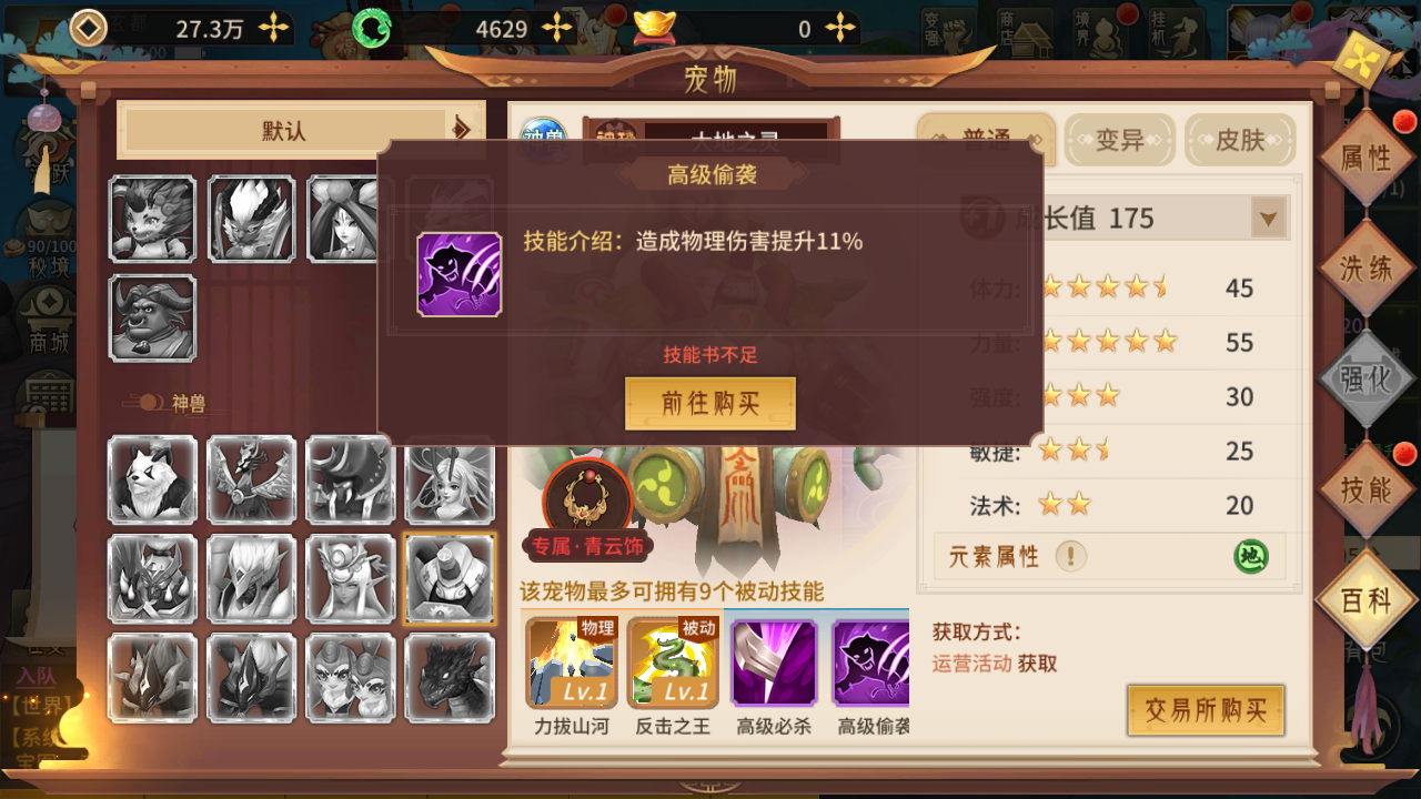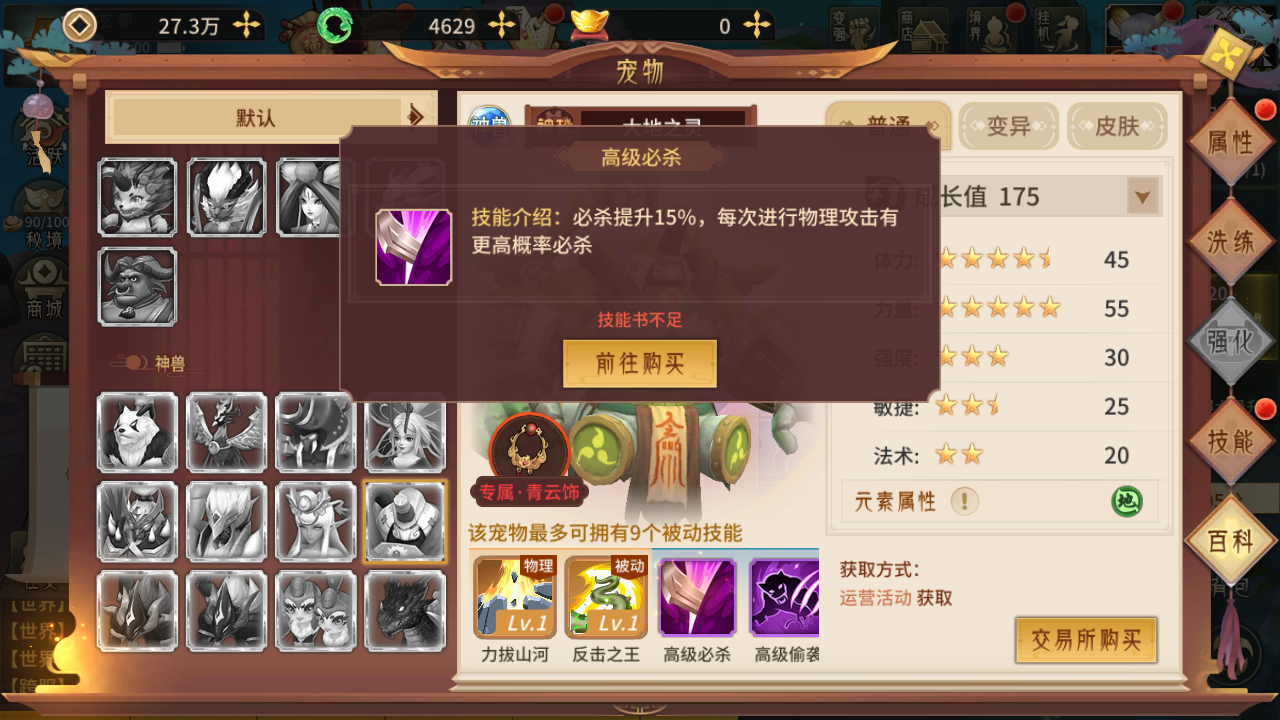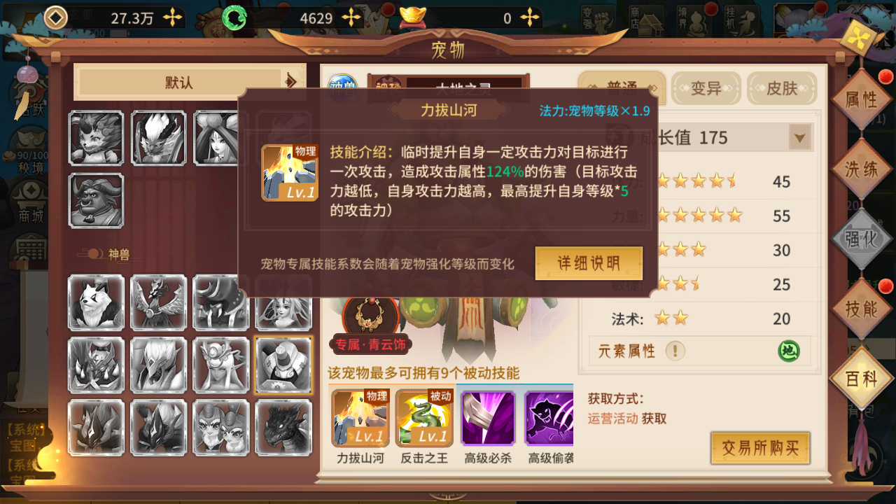 大地之灵这款宠物的技能配置相当强悍,它不仅拥有两个独一无二的专属技能,还附带两个高级技能,通常是必杀与偷袭。作为神级宠物,它最多能通过九个被动技能来增强自身,在实际战斗里能带来可观的属性增益。