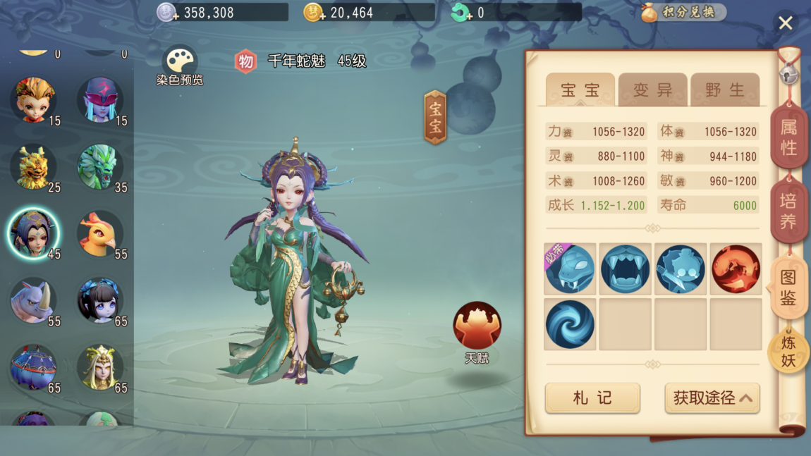 千年魅蛇宝宝拥有暗夜倾城天赋,自带必有毒技能,还能随机领悟吸血、偷袭、高级再生、扰乱这五个技能。无论是捕捉到的野生宝宝,还是经过洗练的宝宝,其技能的生成都是随机的。要是哪只宝宝天生就把这五个技能全部集齐,那它绝对是身价不菲的珍兽宝宝。