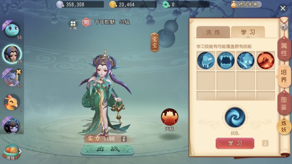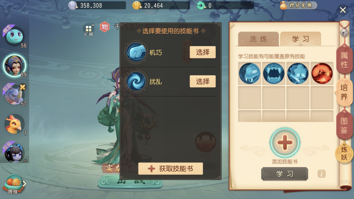 也就是说我们会拥有两个技能。第三点,当宝宝本身带有两个技能时,学习新技能有10%的概率能新增一个技能,剩下90%的概率则会替换掉其中一个原有技能,具体替换哪个技能是随机的;要是连续19次都替换了原有技能,那么第20次就一定会新增一个技能,从而使宝宝拥有三个技能。当宝宝的技能数量达到3个及以上时,使用技能书不会新增技能,只会替换掉一个原有技能。