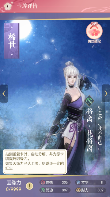 我的卡牌里,每张卡片右上角都标着一个数值,这就是因缘力;不过要是没抽到重复的卡牌,因缘力就只能是0了。