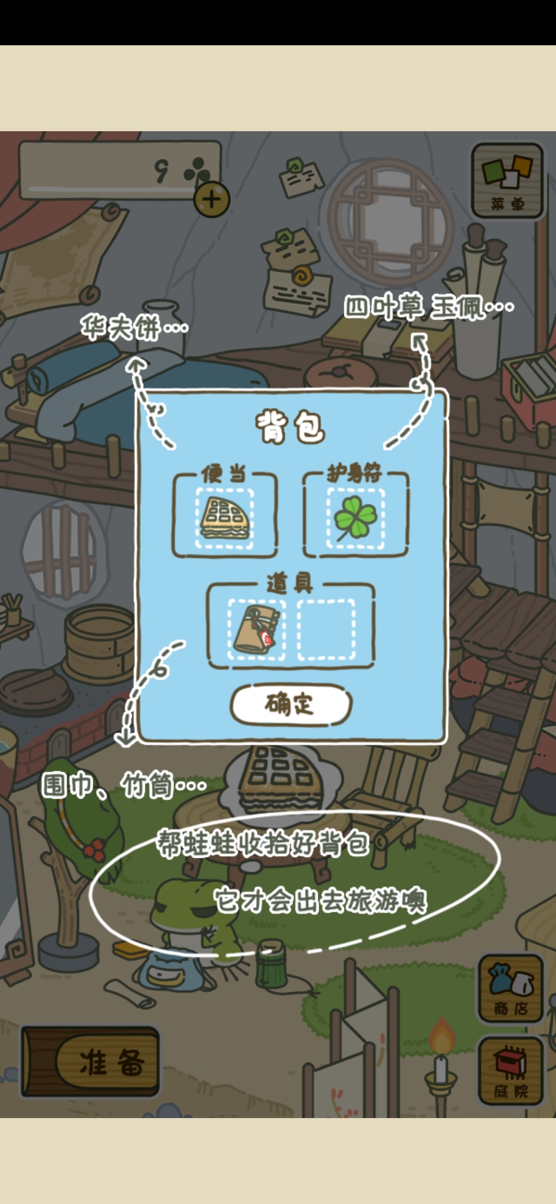 3、小青蛙出门后,玩家仍然可以为它准备下一次出行所需的食物和物品。只要把行李和物品准备妥当并放在桌子上,等小青蛙下次回来时,它就会自行挑选喜欢的东西带上,开启下一次旅行。