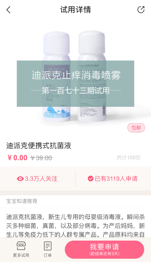 可在线申请免费试用资格,点击主菜单栏【孕育】—【福利社】—【试用】,挑选试用产品,点击【我要申请】即可。