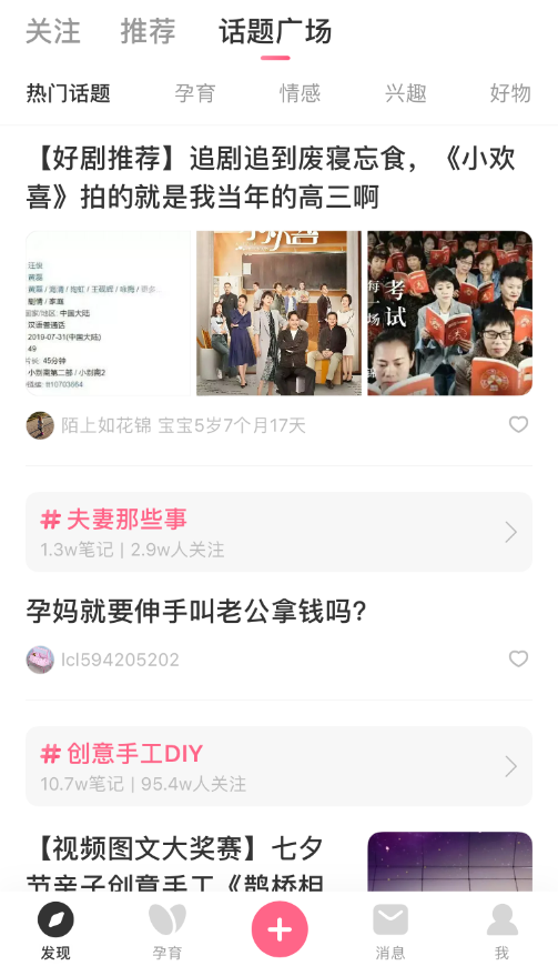 准妈妈和宝妈们可以在线上开展话题讨论,涵盖孕育、情感、兴趣、好物等各类内容。只需点击主菜单栏的【发现】板块,再进入【话题广场】,就能浏览到各种各样的话题了。